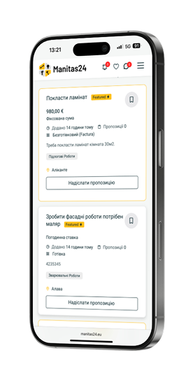 Manitas24 — зручний спосіб знайти фахівця для будь-якого завдання. Публікуйте свою потребу, отримуйте пропозиції від майстрів та обирайте найкращого — легко, швидко, без посередників.